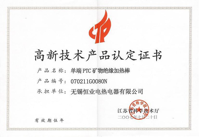 單端PTC礦物絕緣加熱棒高新技術產品認定證書