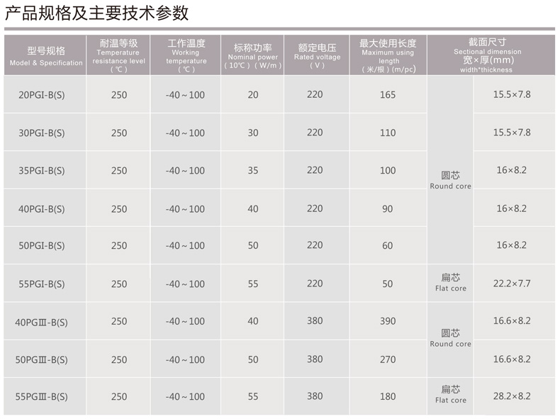 硅橡膠并聯(lián)式電熱帶的電源母線為二根或三根平行絕緣銅絞線, 在硅橡膠骨架層上纏繞P T C合金絲, 并將PTC合金電熱絲每隔一定距離相間交叉即“發(fā)熱節(jié)長"與母線連接,形成連續(xù)并聯(lián)電阻,母線通電后,各并聯(lián)電阻發(fā)熱,因而形成一條連續(xù)的電熱帶。硅橡膠并聯(lián)式電熱帶每米有一定標(biāo)稱功率,使用的電熱帶越長,輸出的總功率越大,但由于采用PTC合金絲作為發(fā)熱元件,因此,其本身具有隨溫度變化而調(diào)節(jié)輸出功率的特性,且電熱帶采用硅橡膠作為絕緣材料,因此,帶體柔軟,便于安裝。該電熱帶在現(xiàn)場能按實際需要長度任意剪切。